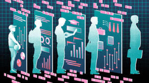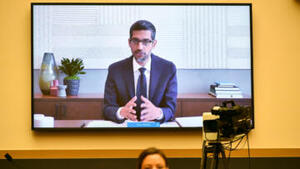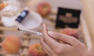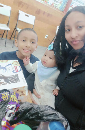 A smiling adult sits with two children at a table. The older child, wearing a navy blue sweatshirt, smiles at the camera while the baby, dressed in a white onesie and a blue bow headband, rests in the adult's arms. The table in front of them holds pac