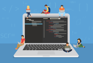 Illustration of a spotlight on four people working at a table. In the shadows there are