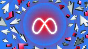 Illustration of Meta's infinite loop logo in the center, with several pixelated cursors and blocks surrounding it.