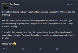 Mastodon post by me: I don't think they're on here yet, but all the same, big shout out to #1Password this morning. I've had an issue with 1Password on my phone for months that I just didn't get around to doing anything about: suggestions would pop up in