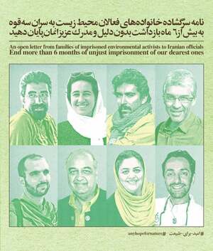 Une affiche de campagne où figurent les défenseurs de l’environnement Taher Ghadirian, Niloufar Bayani, Amirhossein Khaleghi, Houman Jokar, Sam Rajabi, Sepideh Kashani, Morad Tahbaz et Abdolreza Kouhpayeh, qui sont détenus depuis début 2018 en Iran. En no
