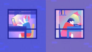 Illustration of two students at home during lockdown, one has technology and is studying the other doesn't and is bored