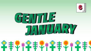 Digital illustration of the words “Gentle January” over a field of pixelated flowers; in the right-hand corner there is the number “6” placed on a stack of post-its