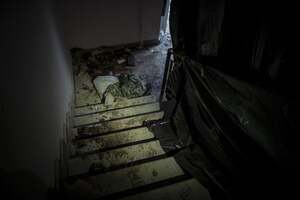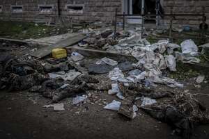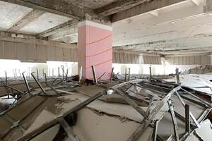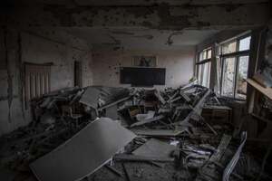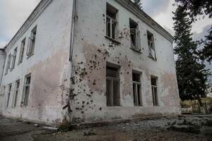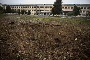 A missile crater in a paved road and shelling damage to the exterior of a school