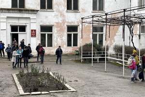 Soldiers with equipment in front of a school building with smoke rising from the top