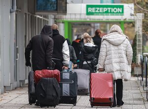 Мигранты перед зданием бывшего отеля Grand City Hotel Berlin, Германия, 11 ноября 2024. Фото: Hannibal Hanschke / EPA-EFE