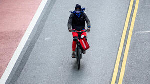 A Grubhub delivery person rides a bicycle on 42nd street during the coronavirus pandemic on May 18, 2020 in New York City.