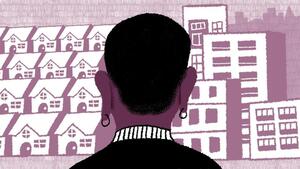 Illustration of the back of a person's head. The person is POC, with short hair and earrings. On the left side are rows of houses, on the right side are a bunch of tall buildings in a city.