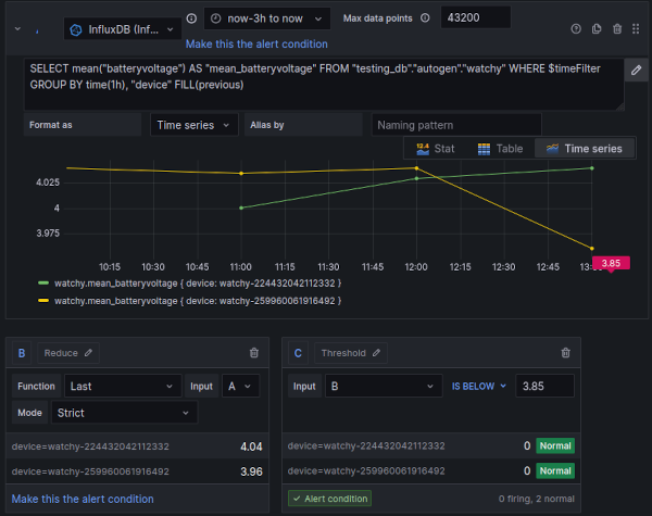 Screenshot of Grafana alert config - have configured an InfluxQL query (see above) with a reduce of last and a threshold of 3.85