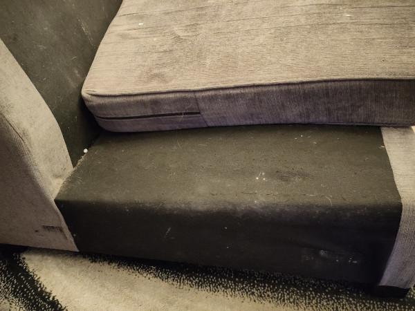 The end of the sofa. The metal brackets that would have attached it to the other part of the sofa have been removed and the cushion's been moved back to give us space to work