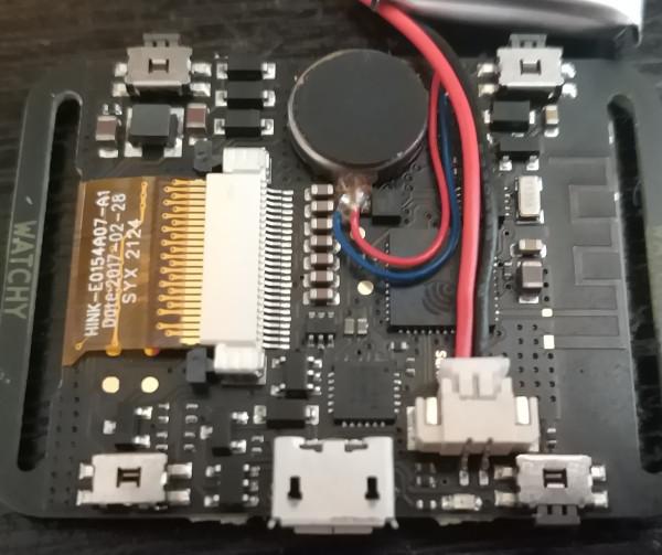 Photograph of the back of a Watchy board - all components are visible except for the e-ink display which is on the other side