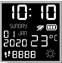 Screenshot of the 7seg watchy watchface. It's pretty densely packed with information - time, date, battery level, wifi state, temperature, weather indicator and step counter