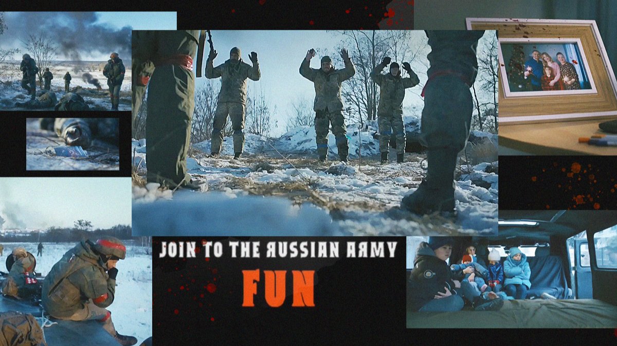 A Ukrainian soldier stands on the wreckage of a burnt Russian tank.