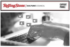 Woman writing social media posts on laptop.
