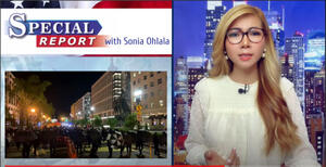 Screenshot of a Youtube video of Sonia Ohlala, who is wearing a white blouse and glasses. To the left of her are the words "Special Report with Sonia Ohlala" and a video of people out on the street at night.