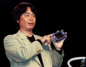 Legendary video game developer Shigeru Miyamoto holds up the new Nintendo Game Boy Advance in Los Angeles, May 2001.