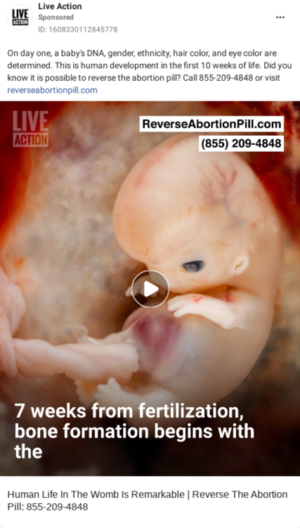 Screenshot of a Facebook ad that shows a video of a fetus. Text that says "7 weeks from fertilization, bone formulation begins with the" is overlayed on the video.