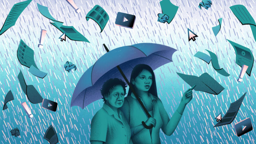 Illustration of a young Asian woman holding an umbrella while walking with an older Asian woman; both are being shielded by falling exclamation points and YouTube thumbnails