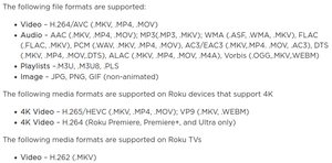 Screenshot of the Roku supported formats. Video is H.264 only unless you have a 4k stick which also supports h.265
