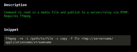 Screen shot of snippet detailing using ffmpeg to stream video to a RTMP relay