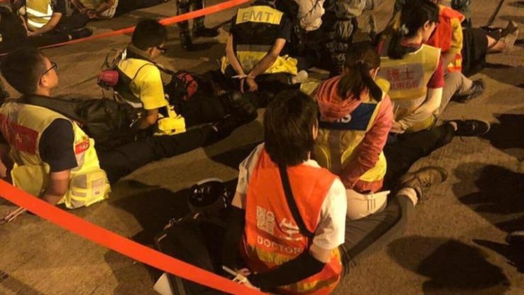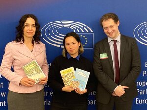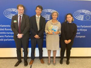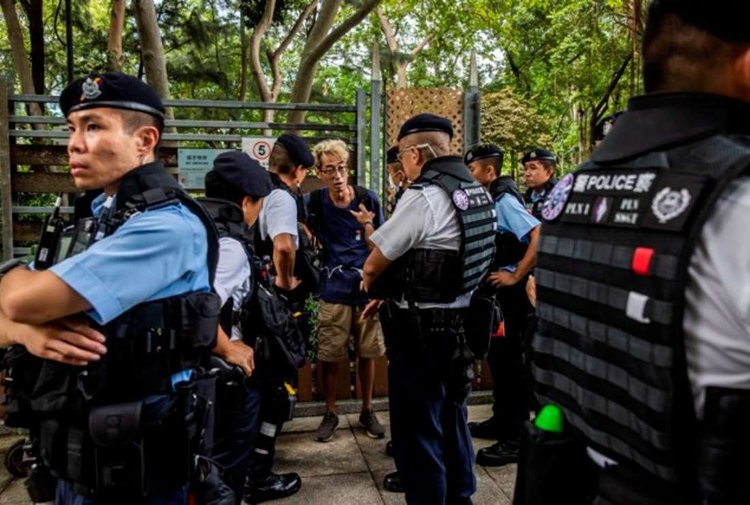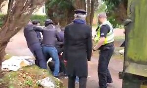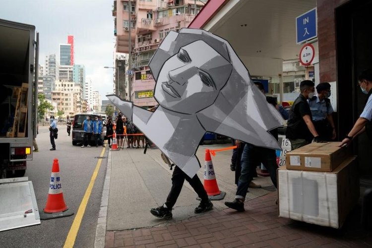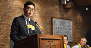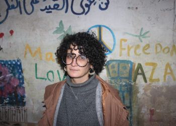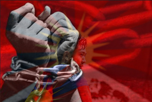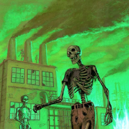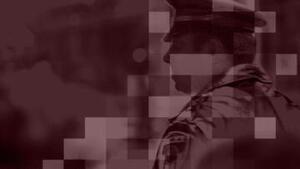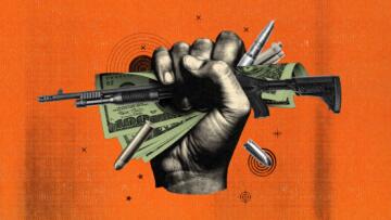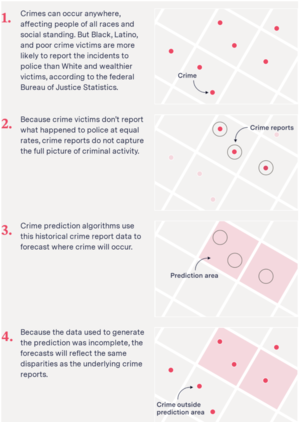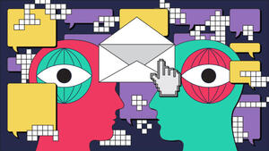 Illustration of an iceberg with a small figure standing at the top, gazing downward; the top half is in front of a ChatGPT input form; the bottom half is a collage featuring imagery of power plants, copyright symbols, a surveillance map, people crying, an